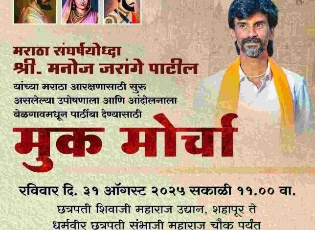 बेलगाम प्राईड/ मराठा समाजाला आरक्षण मिळावे या मागणीसाठी जालना येथे आंदोलन करणारे मराठा नेते मनोज जरांगे पाटील यांना पाठिंबा देण्यासाठी बेळगावातर्फे भव्य मूक मोर्चाचे आयोजन करण्यात आले आहे.