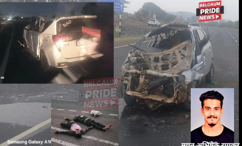 अभिषेक रायकर हा युवक इव्हेंटचे कार्यक्रम करत असून शनिवारी रात्री कित्तूर नजीक कार्यक्रम करून पहाटे बेळगावला आपल्या कार क्रमांक के ए 22 एन 4076 मारुती अल्टो या कारमधून येथे वेळी पहाटेच्या वेळी समोरून जात असलेल्या दुचाकी क्रमांक के ए 22 डब्ल्यू 2269 या दुचाकीला ठोकल्याने तर यानंतर दुभाजकावरून जाऊन समोरून येणाऱ्या इनोव्हाकार क्रमांक के ए 22 एमडी 1586 याला ठोकल्याने हा तिहेरी अपघात घडला.